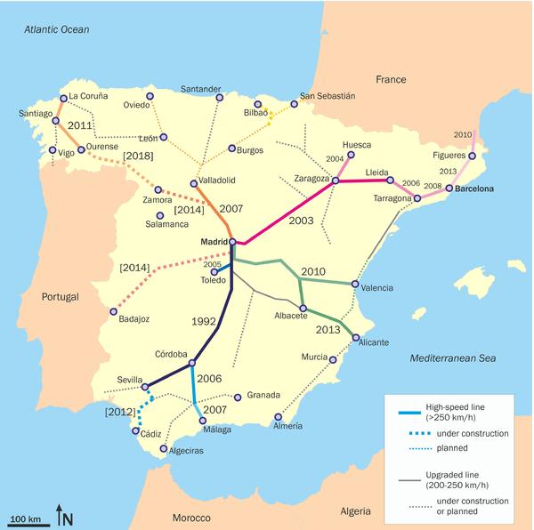 スペインの高速鉄道網の整備状況については、十分な情報は入手出来ていないが、やや古いものだが、或る時点での整備状況と導入計画は下図の様である。図中、点線で示してある、マドリードからサンチアゴなどの、工事中の路線も、現在は、開通しているものと想定される。(AVE - Wikipedia)