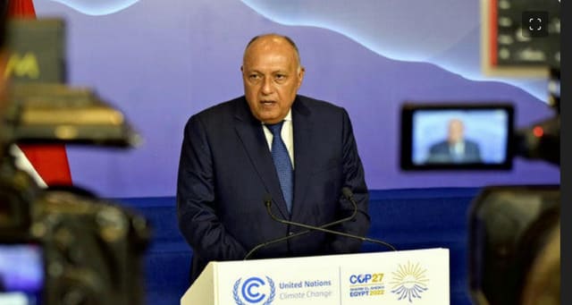 記者団に対して、交渉妥結の決意をつたえる、議長役の、エジプト サメハ外相